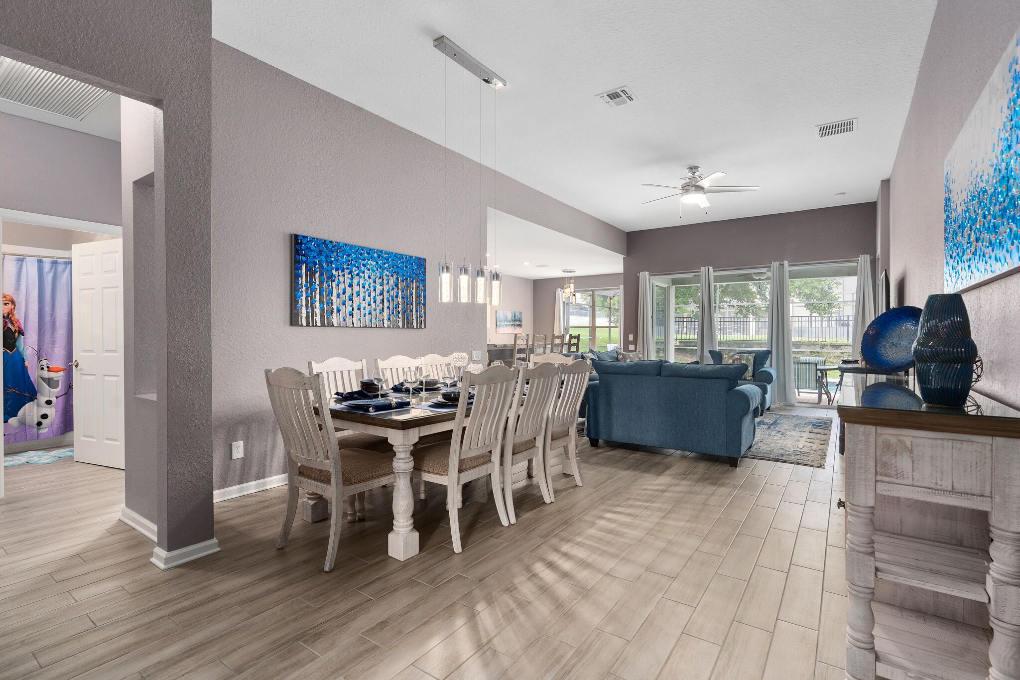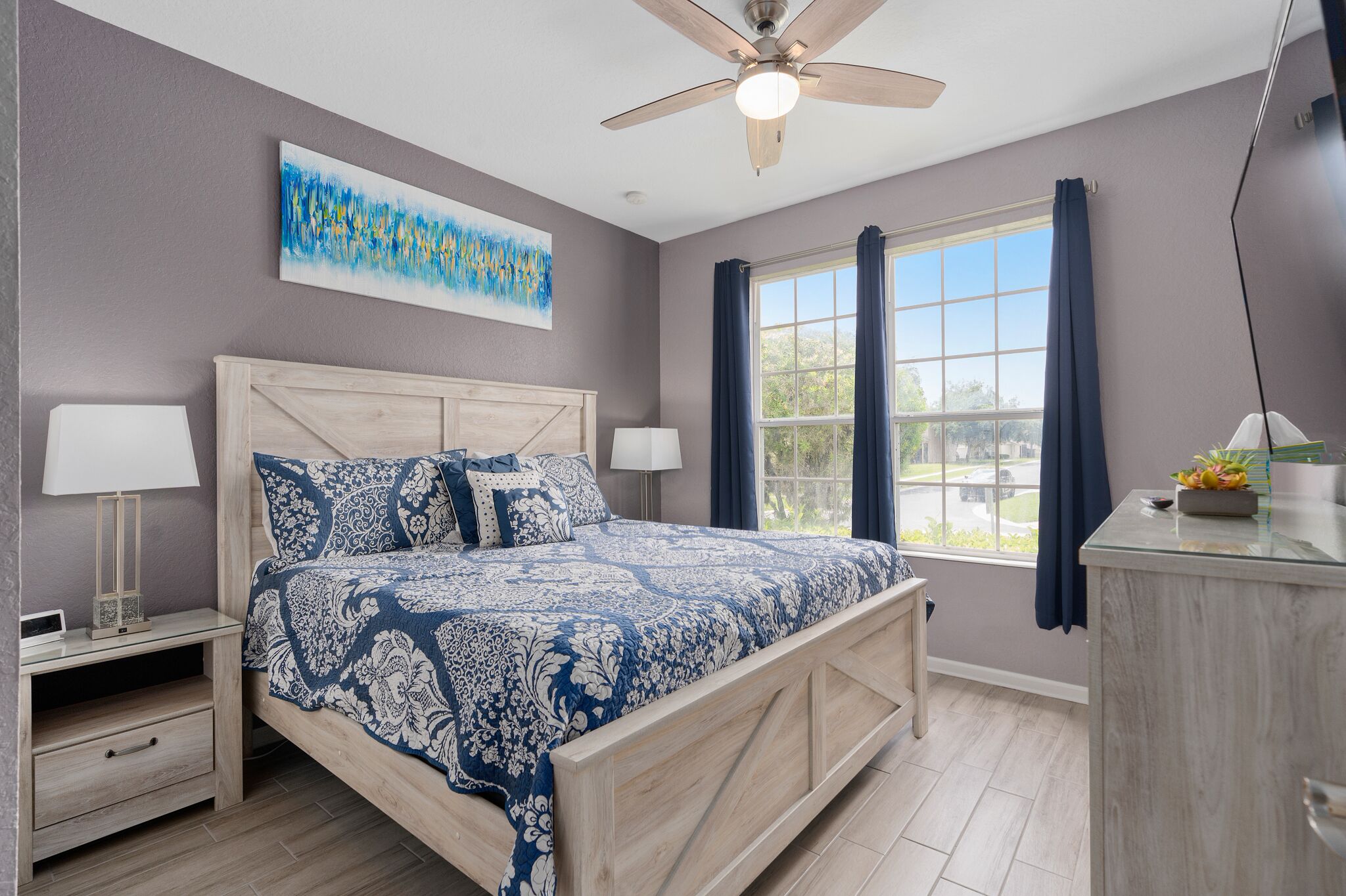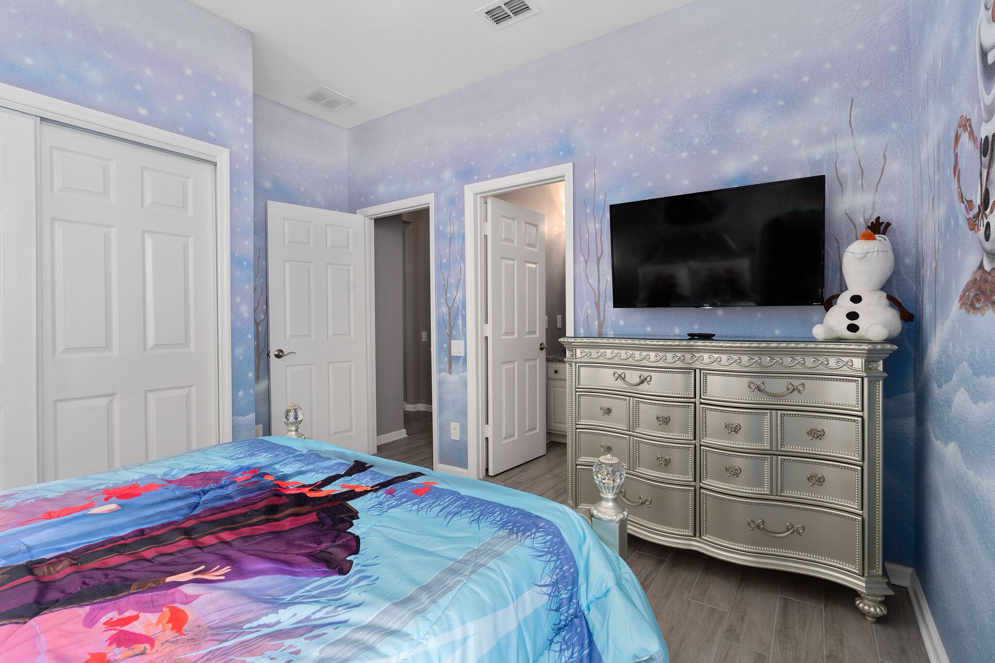 Welcome to Chillax Inn Teascone, a luxurious 4-bed, 4-bath vacation rental in Windsor Hills Resort, just minutes from Disney World! This one-level home features two king master suites and themed bedrooms, perfect for families. Enjoy a private pool, modern kitchen, and resort amenities, including a waterpark, fitness center, and playground. Your perfect family getaway awaits! 7737 Teascone Blvd, Kissimmee, Florida 34747 The Space: LIVING ROOM: Private living room Smart TV with satellite/cable Free Wi-Fi KITCHEN: Fully equipped kitchen with modern appliances Keurig Duo coffee maker Dining table with seating for 8 Kitchen island with seating for 4 BEDROOM #1: King bed with ensuite bathroom Premium linens and bedding BEDROOM #2: King bed with ensuite bathroom Premium linens and bedding BEDROOM #3 (Frozen Themed): Full bed with ensuite bathroom Themed decor BEDROOM #4 (Star Wars Themed): Full/Full bunk bed with ensuite bathroom Themed decor BATHROOMS: 4 full bathrooms, all ensuite Towels and basic toiletries provided OUTSIDE: Private pool (heated upon request for $30 per night) Lanai/Gazebo (covered) Outdoor seating with dining for 6 Sun loungers available RESORT AMENITIES: Communal pool (closed Sept 3-Oct 4, 2024 for resurfacing) Waterpark and children’s pool Fitness room and tennis courts Playground and sidewalks throughout the resort FAMILY FEATURES: Baby gate, Pack N Play/Travel crib Room darkening shades in bedrooms Book your stay and experience a magical vacation near all the Orlando attractions! NEARBY: Disney Magic Kingdom (~5 mi) - Step into a world of fairy tales with iconic attractions, beloved characters, and the enchanting Cinderella Castle. Disney Animal Kingdom (~6 mi) - Explore exotic animals, thrilling rides, and live shows in a lush, immersive environment. Disney Epcot (~8 mi) - Discover global cultures, futuristic technology, and culinary delights in this park that celebrates human achievement. Disney Hollywood Studios (~9 mi) - Step into the world of movies and TV shows with themed rides, entertainment, and attractions. Universal Studios Florida (~16 mi) - Immerse yourself in blockbuster movies and TV shows with thrilling rides and interactive attractions. SeaWorld Orlando (~13 mi) - Dive into marine life exhibits, thrilling rides, and live shows at this famous aquatic theme park. Celebration Golf Club (~8 mi) - Play a round at this beautiful course designed by renowned architects, offering a challenging yet enjoyable experience. Celebration Town Center (~9 mi) - Stroll through this charming community with shops, restaurants, and picturesque scenery. Old Town Kissimmee (~8 mi) - Enjoy classic car shows, shopping, dining, and family-friendly entertainment in this charming venue.
