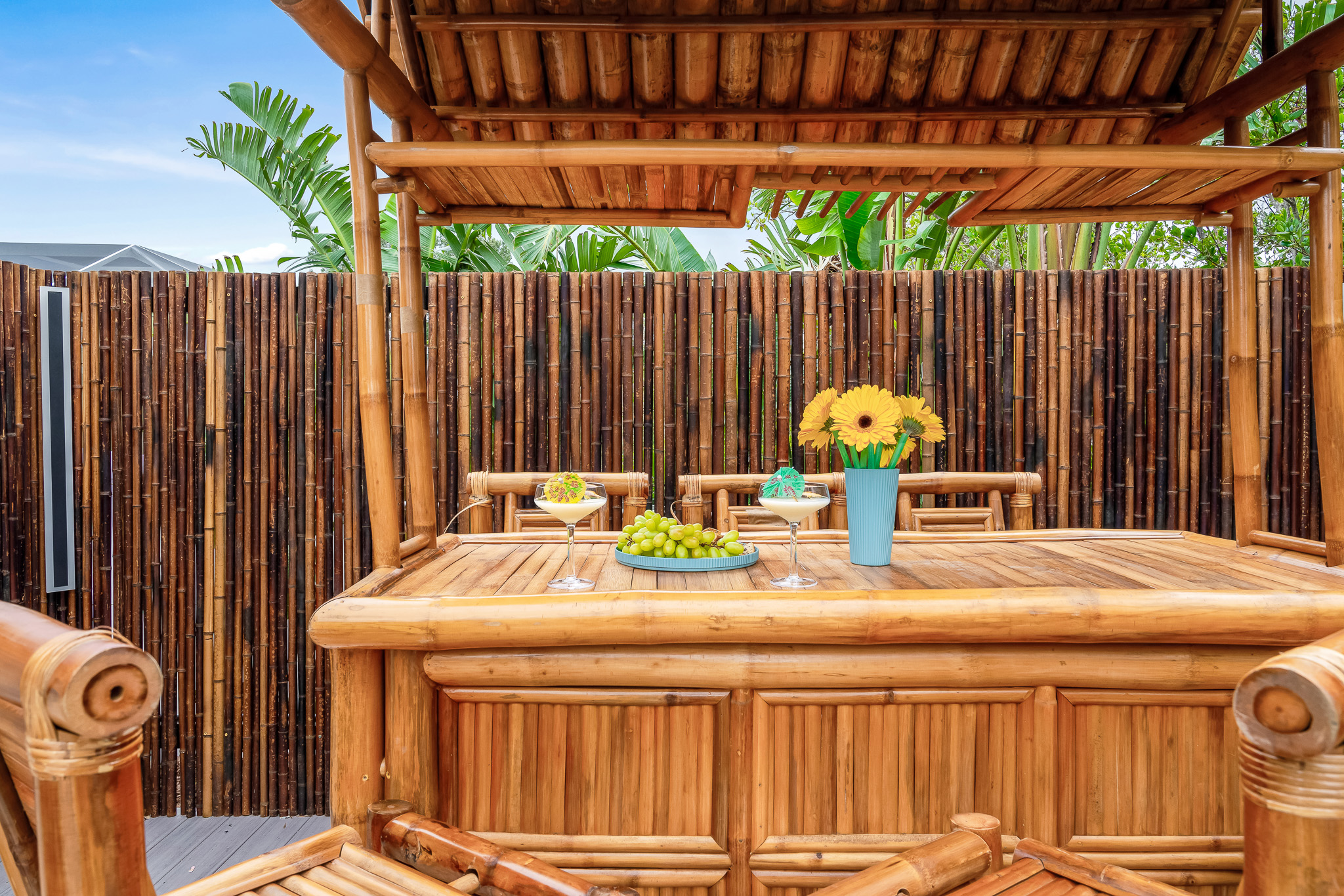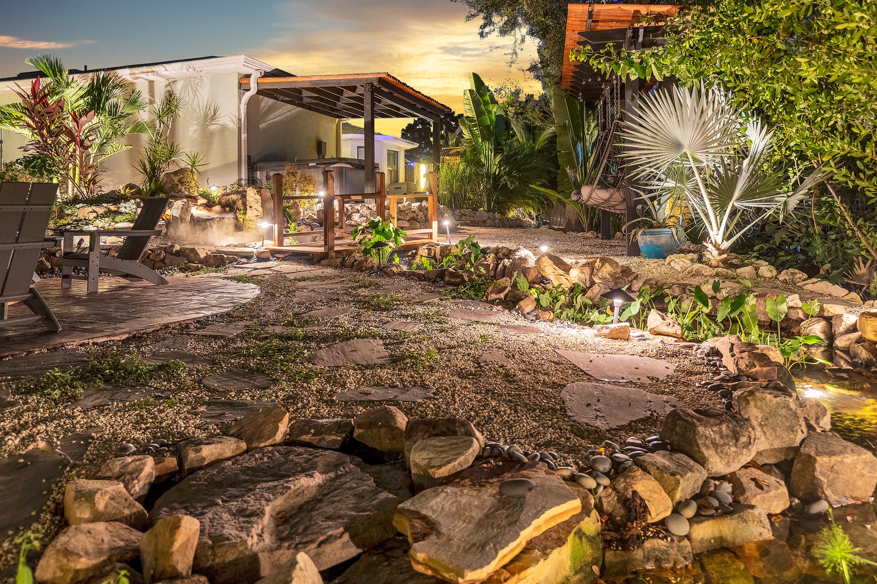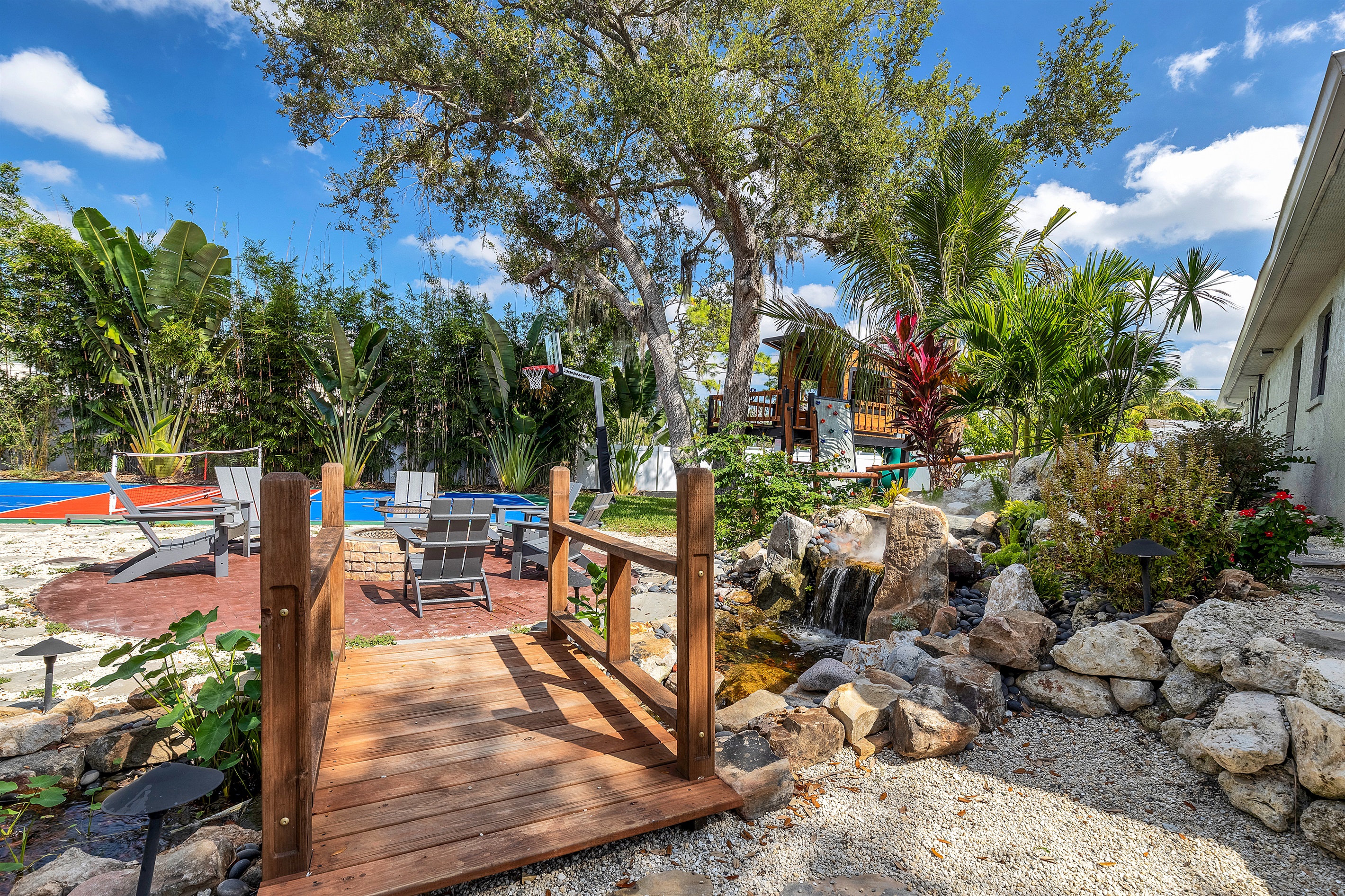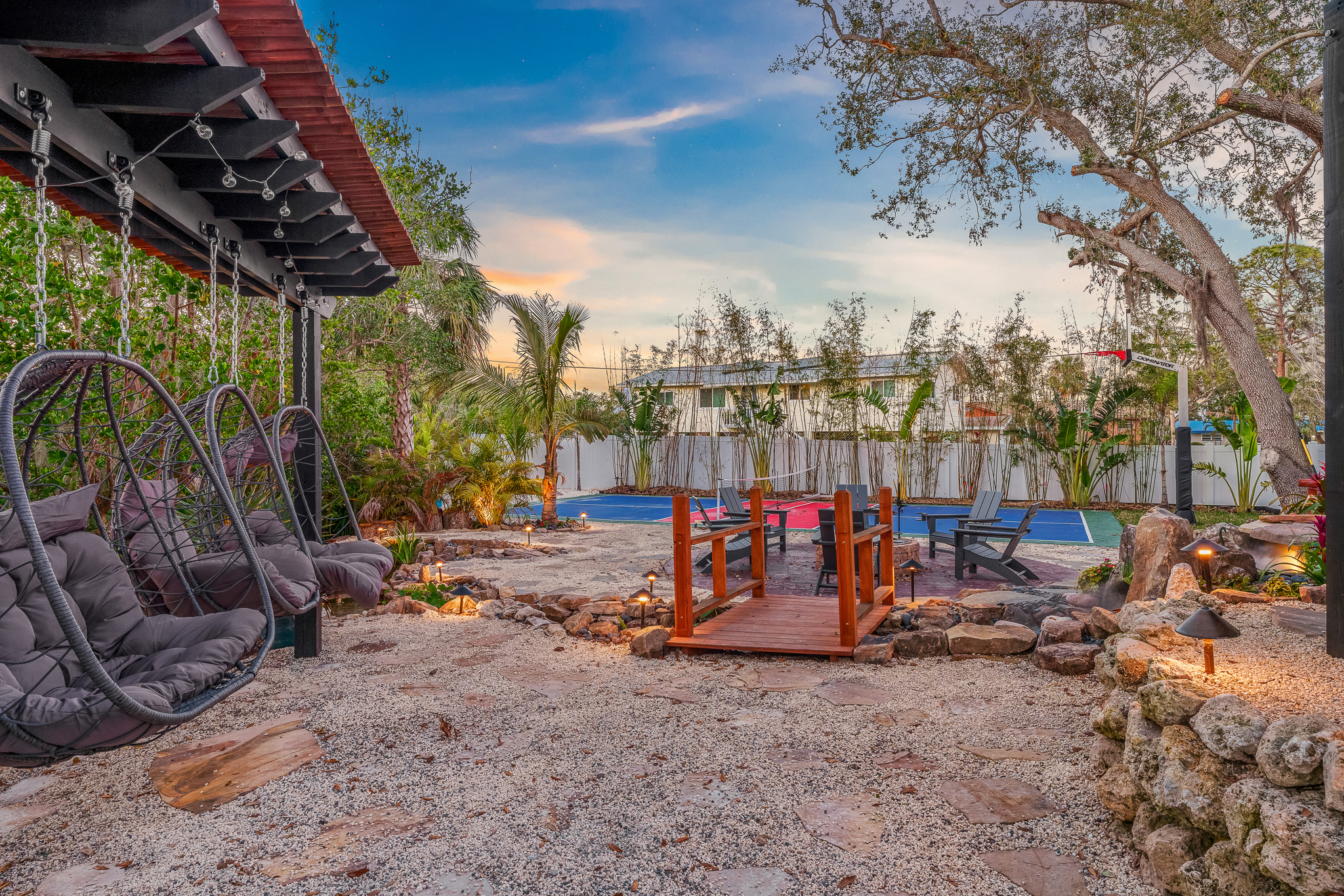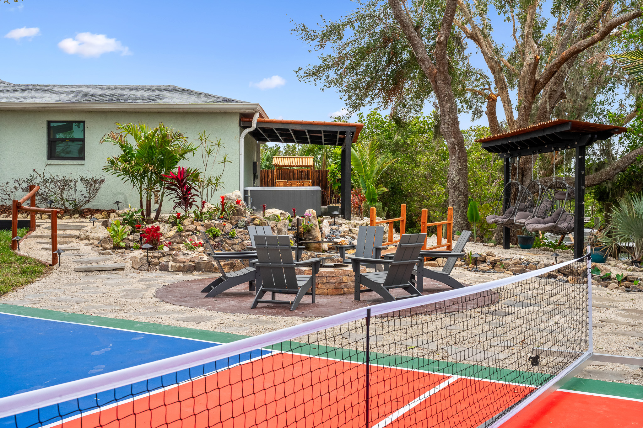 By midday, the backyard becomes the heart of the stay. Float in the heated pool, relax in the hot tub beneath the bamboo pergola, or challenge the family to a pickleball match while the grill gets going. As the sun sets, gather around the fire pit, listen to the waterfalls, and watch the lights reflect off the water it feels like your own private resort.