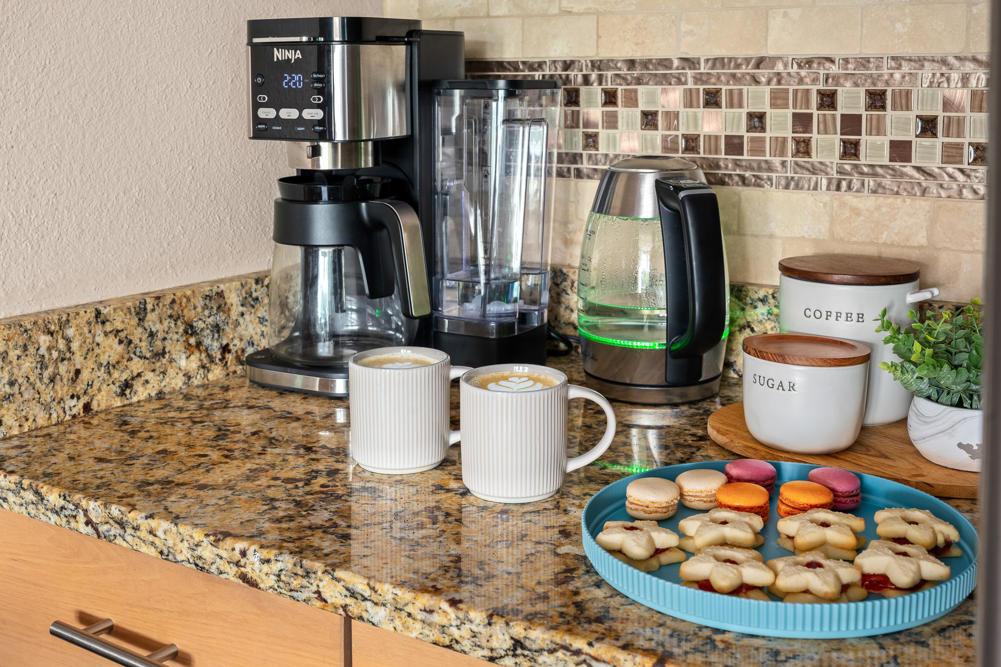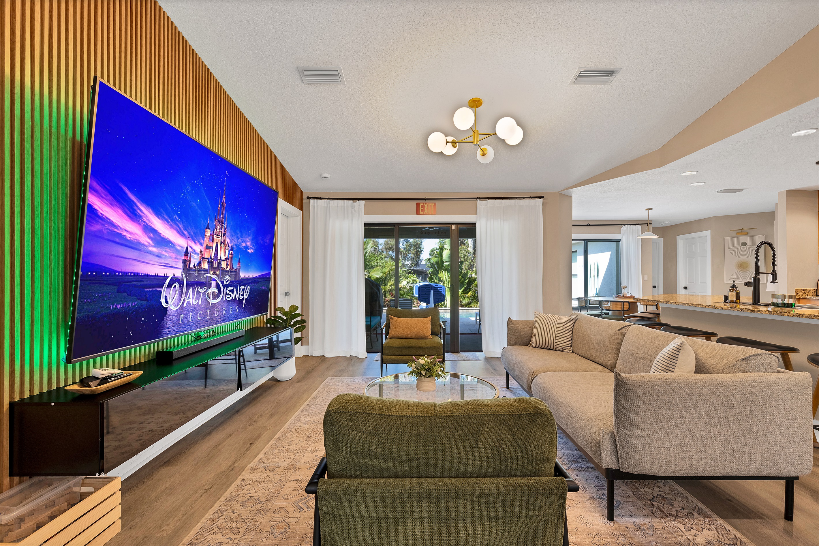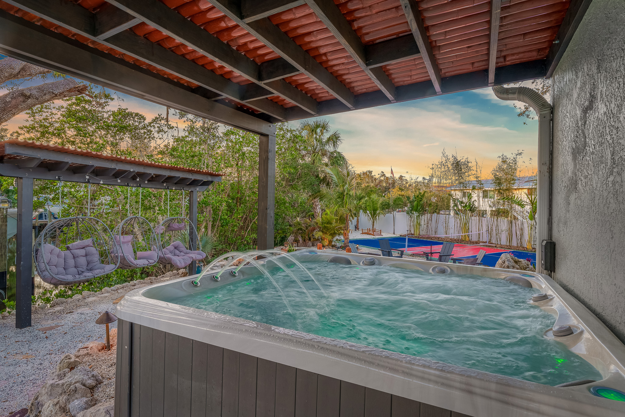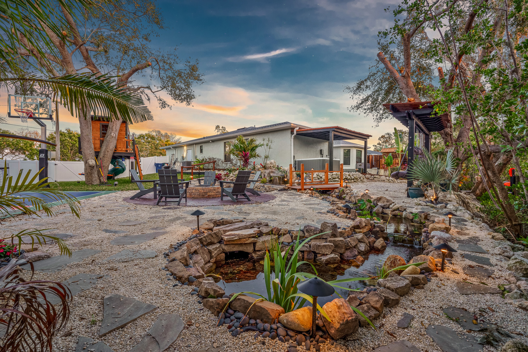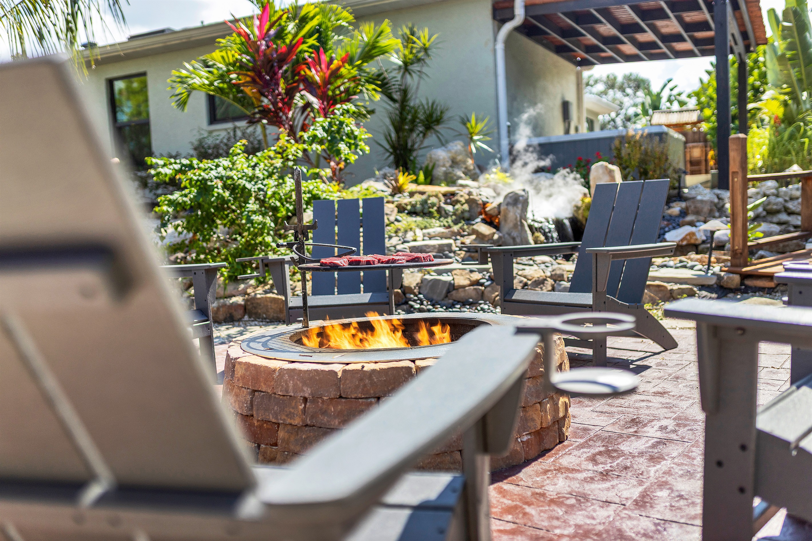 By midday, the backyard becomes the heart of the stay. Float in the heated pool, relax in the hot tub beneath the bamboo pergola, or challenge the family to a pickleball match while the grill gets going. As the sun sets, gather around the fire pit, listen to the waterfalls, and watch the lights reflect off the water it feels like your own private resort.