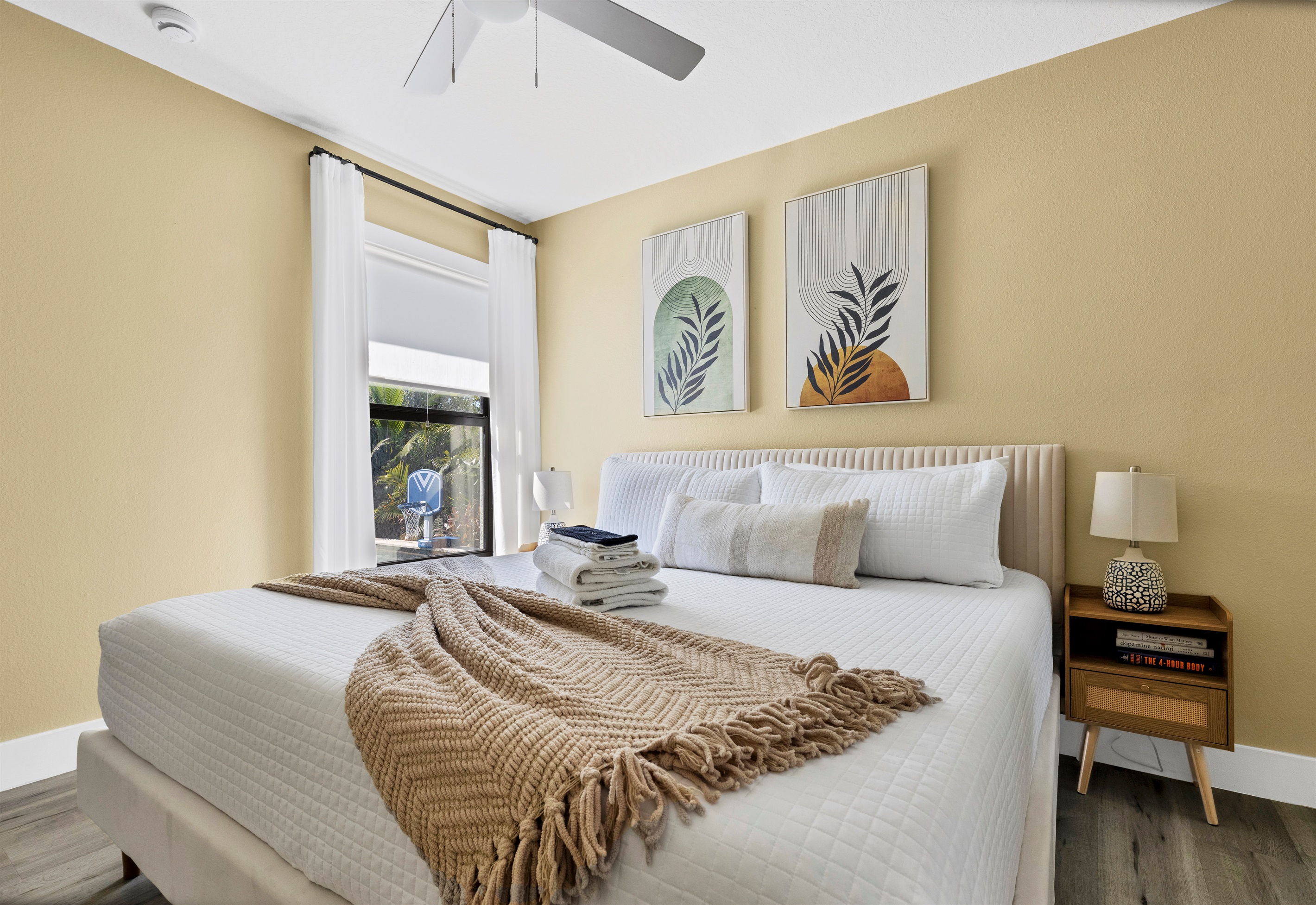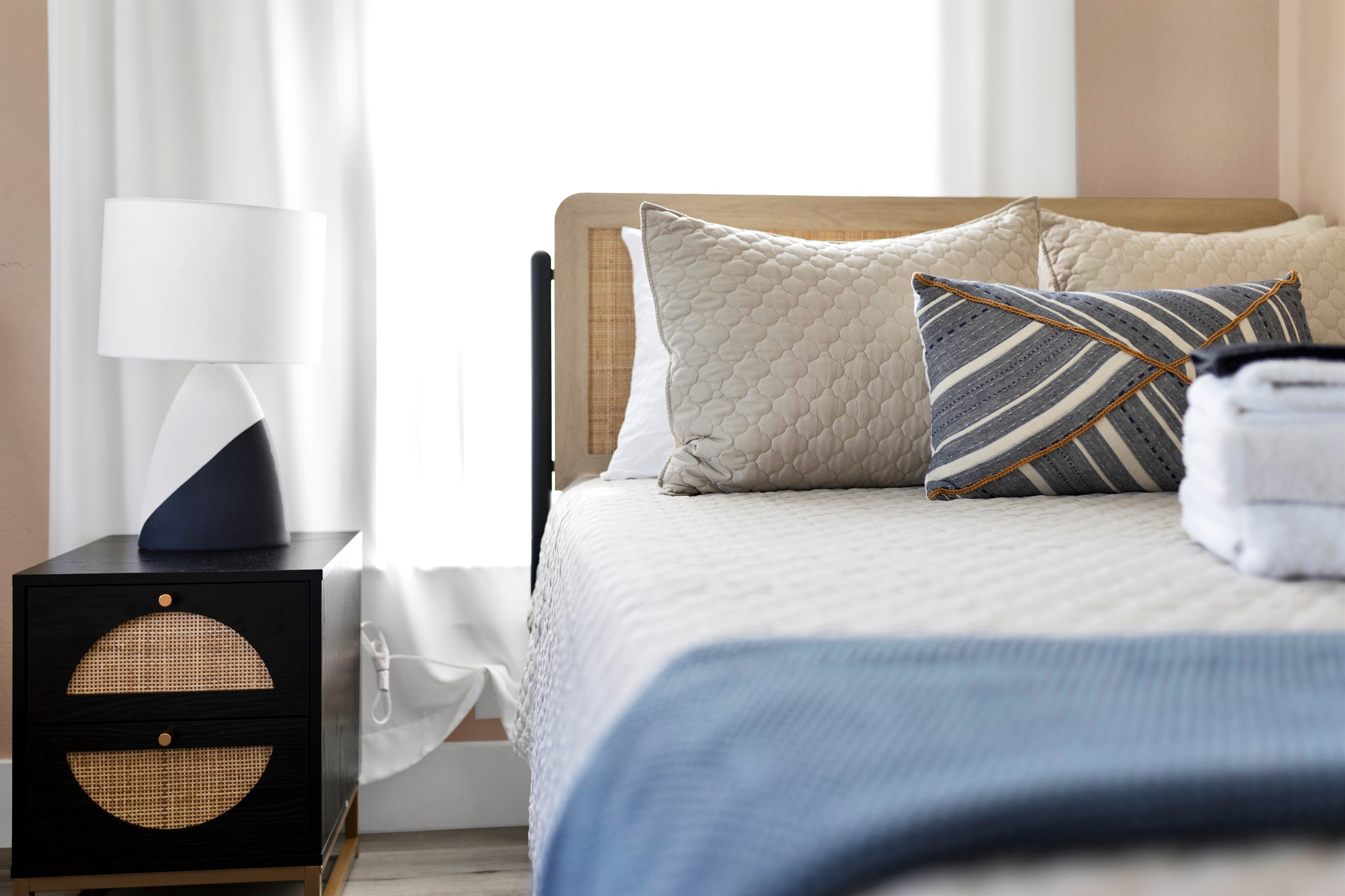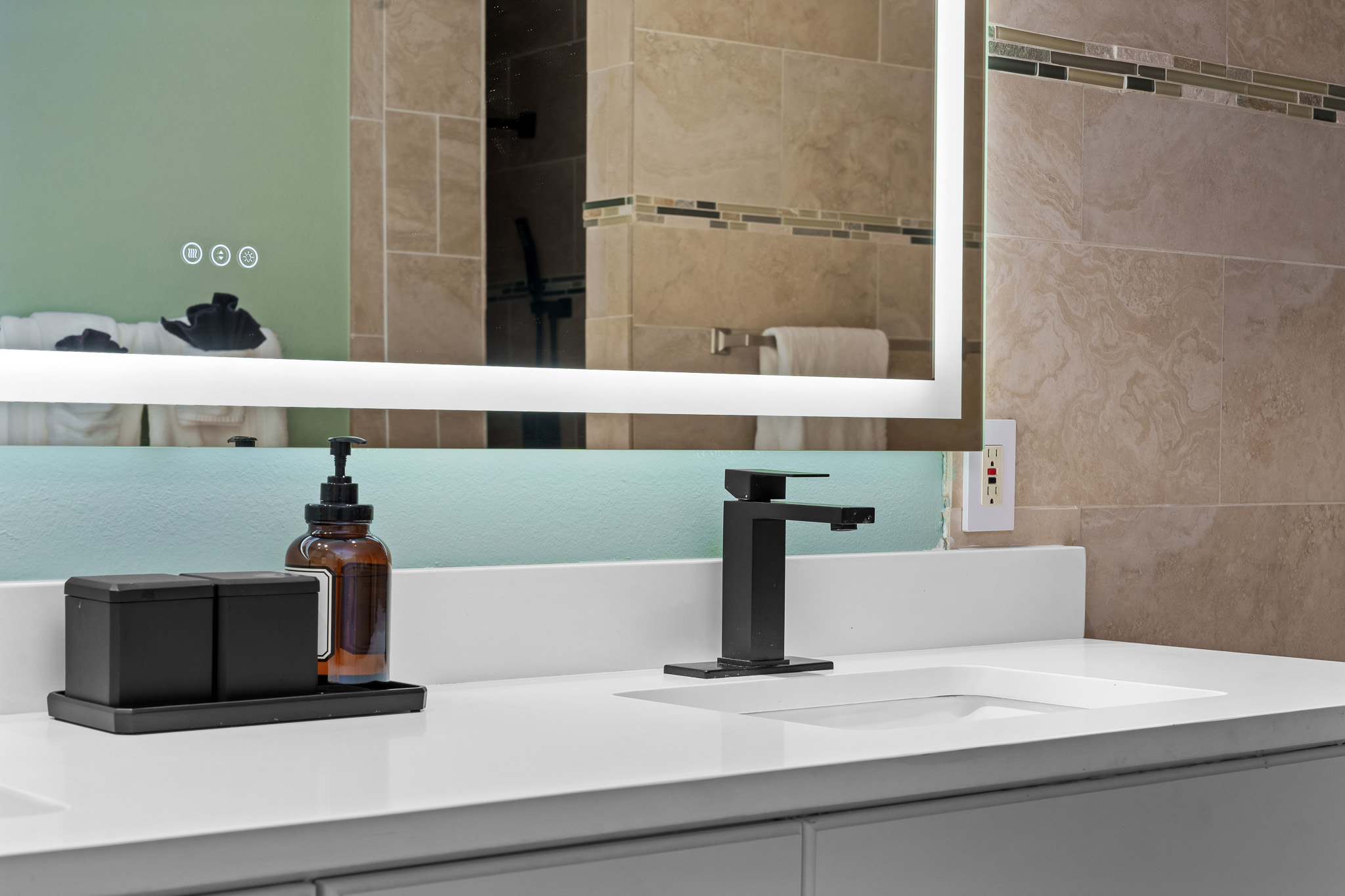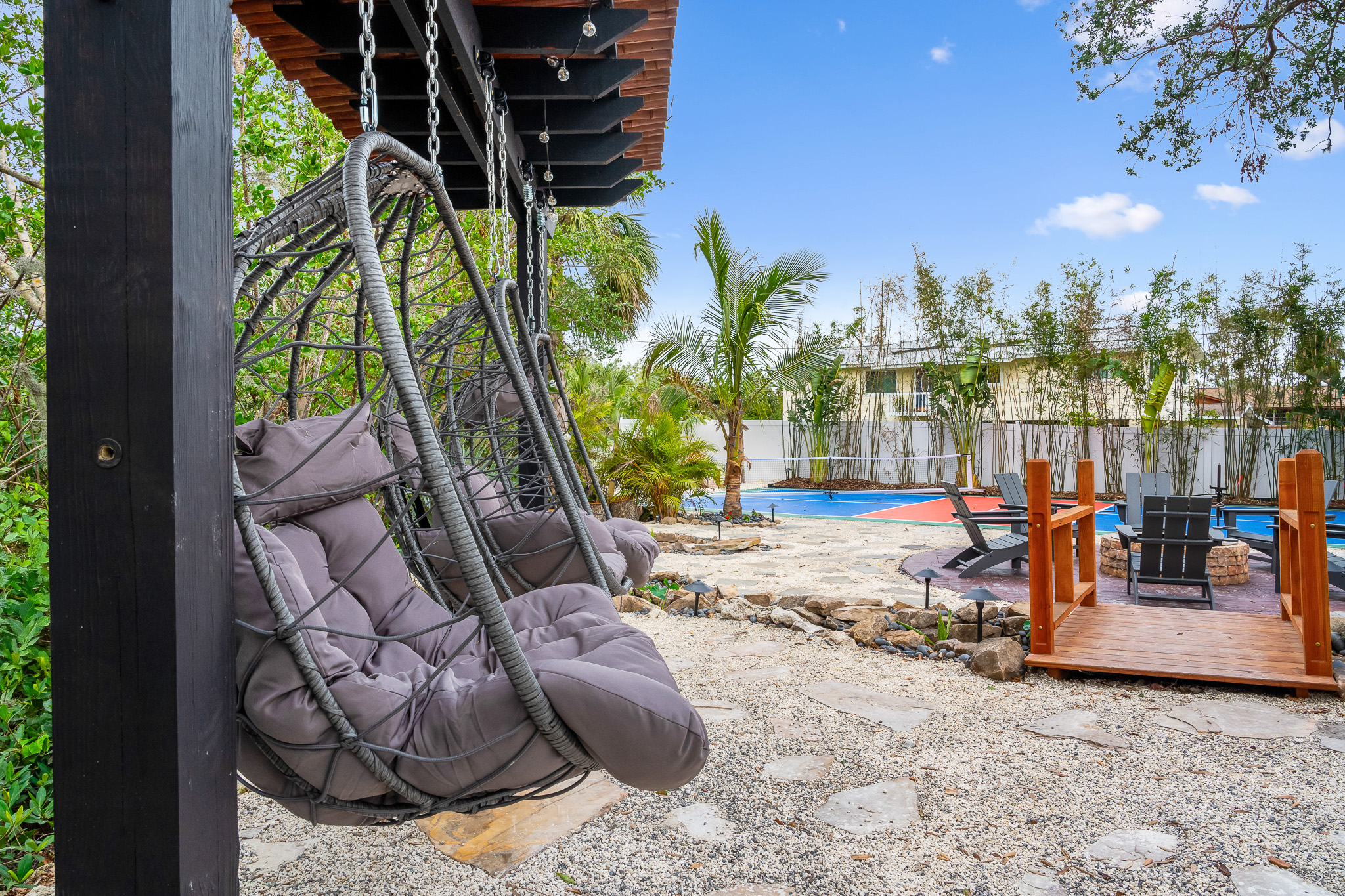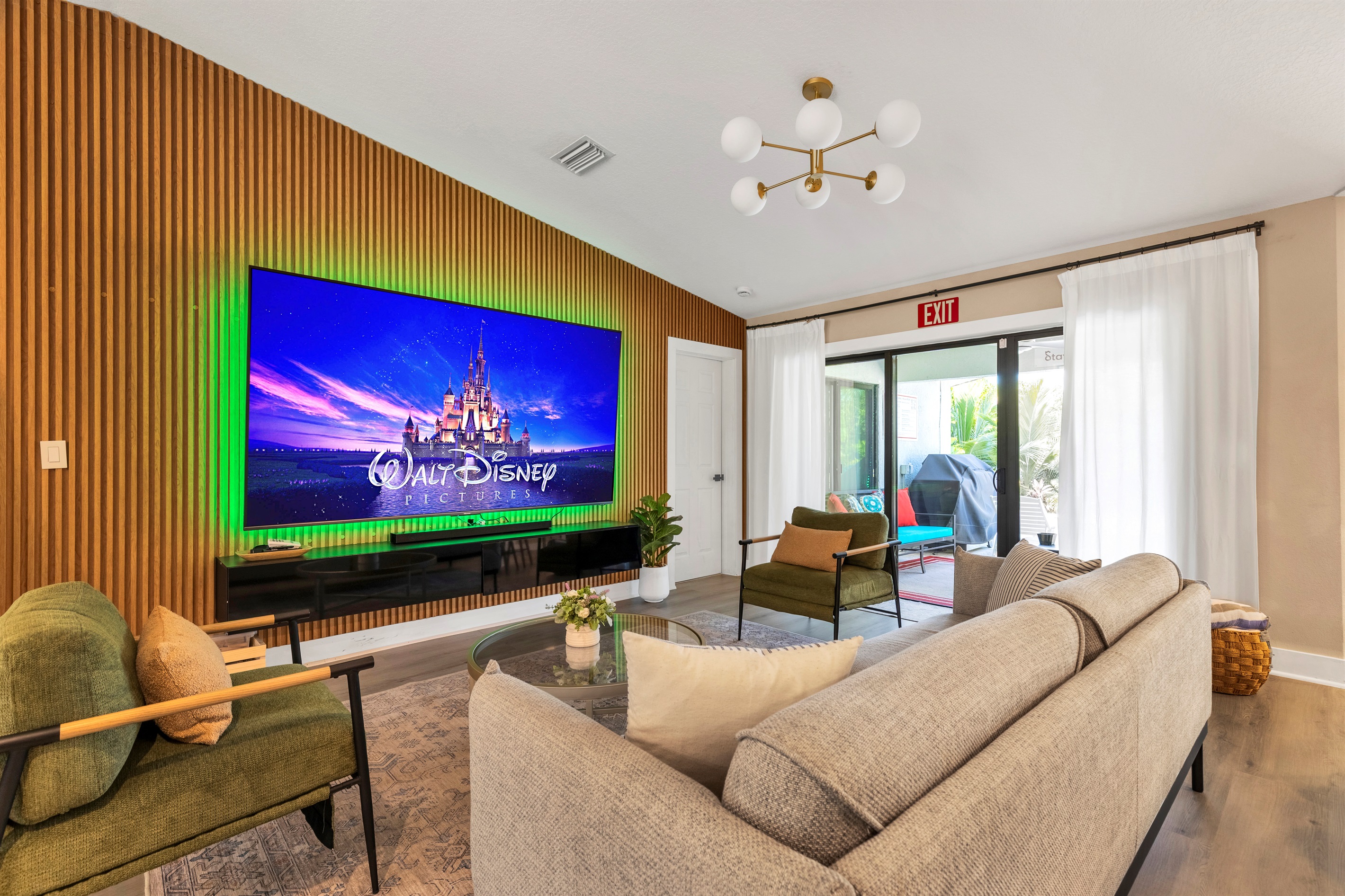 By midday, the backyard becomes the heart of the stay. Float in the heated pool, relax in the hot tub beneath the bamboo pergola, or challenge the family to a pickleball match while the grill gets going. As the sun sets, gather around the fire pit, listen to the waterfalls, and watch the lights reflect off the water it feels like your own private resort.