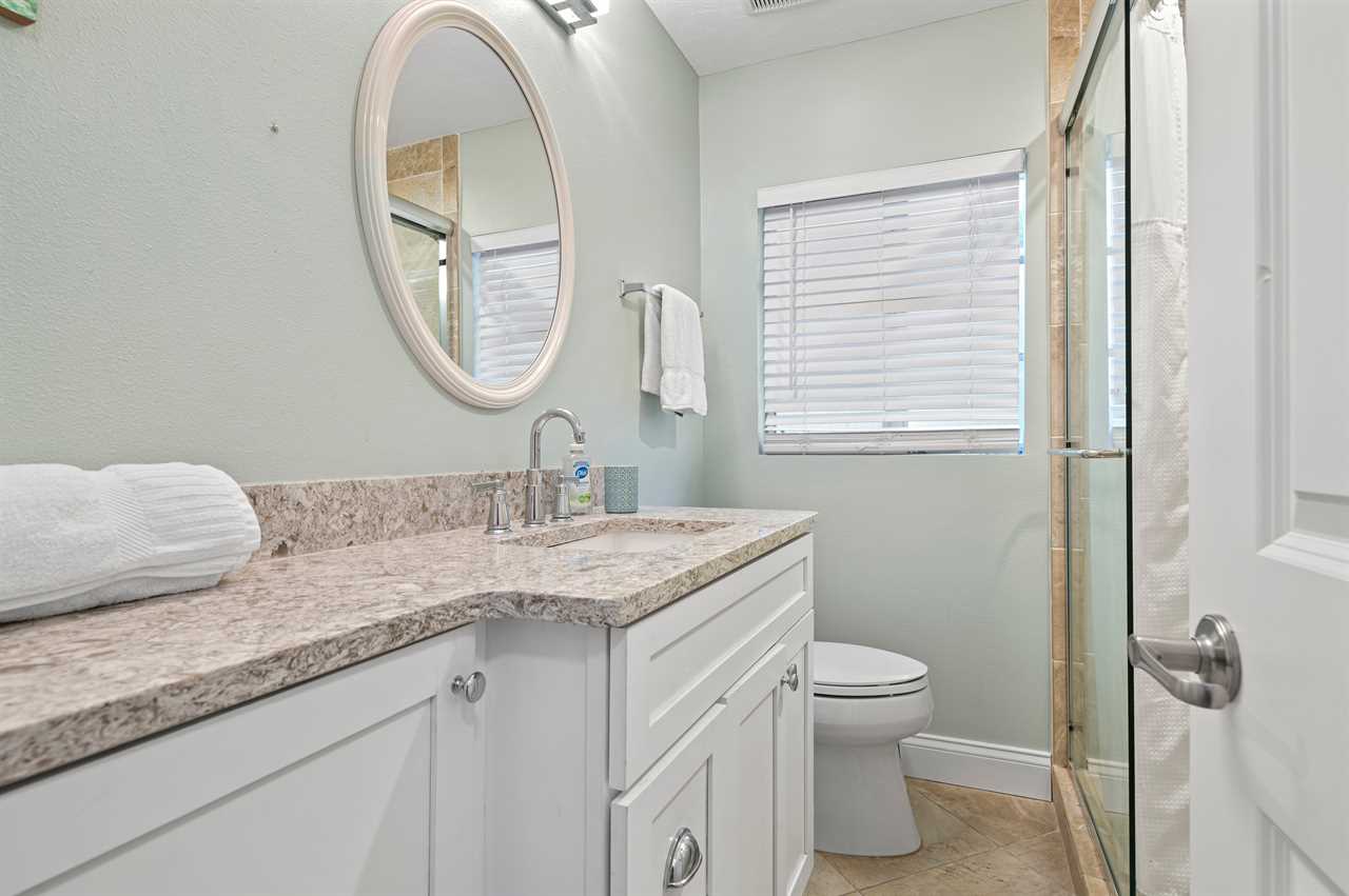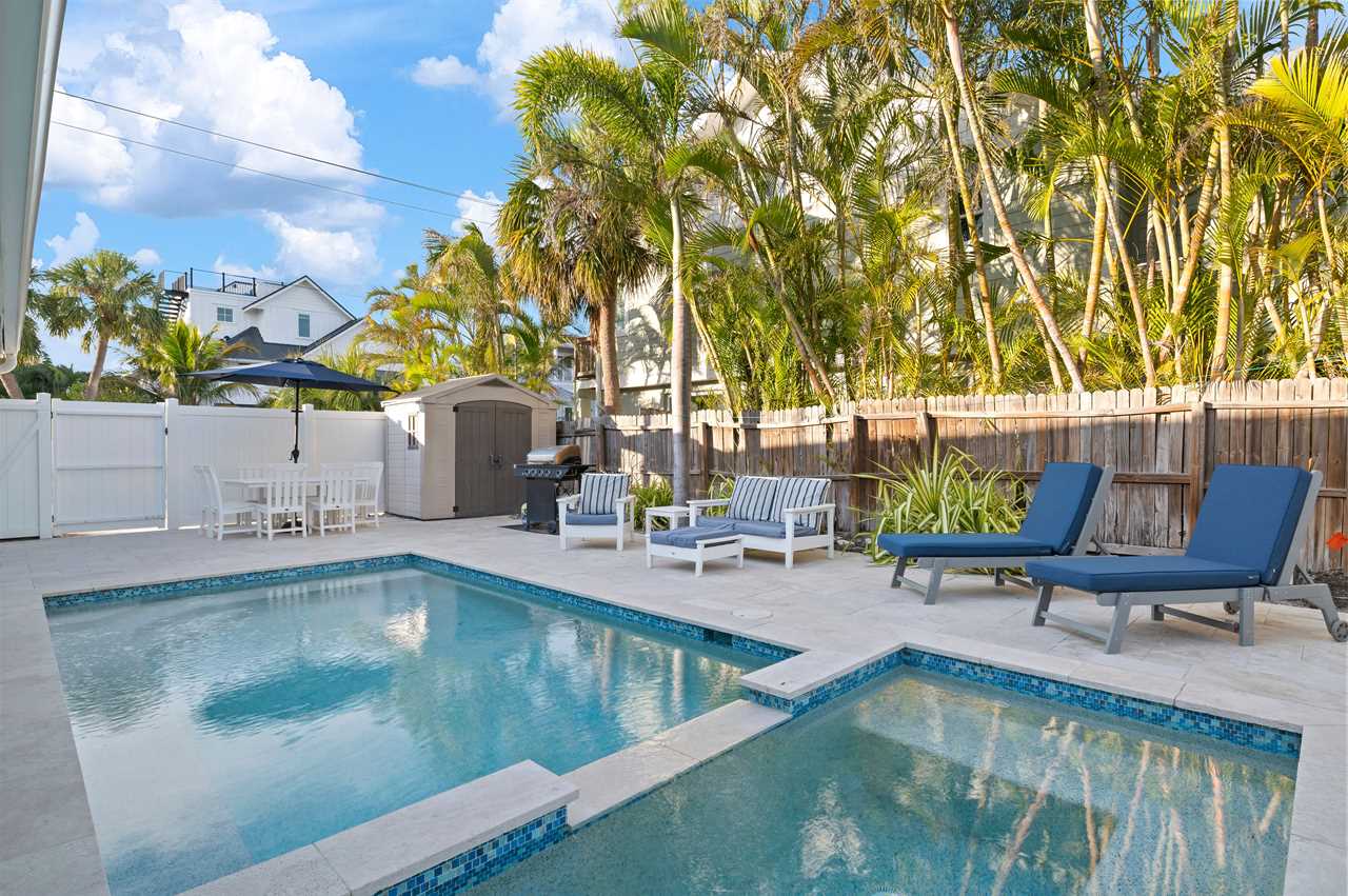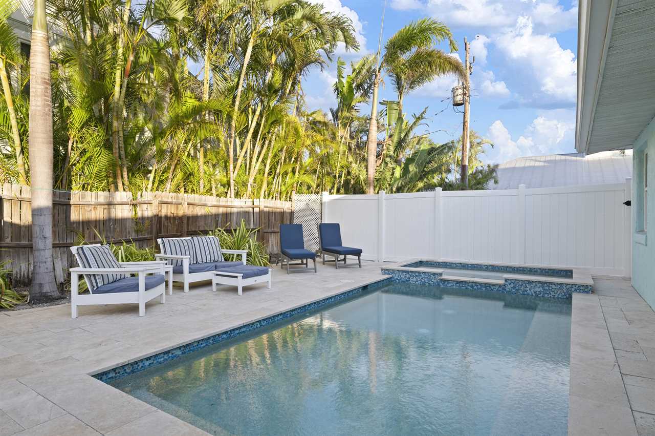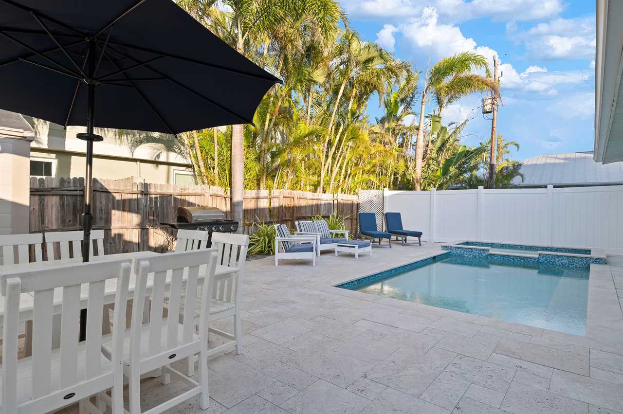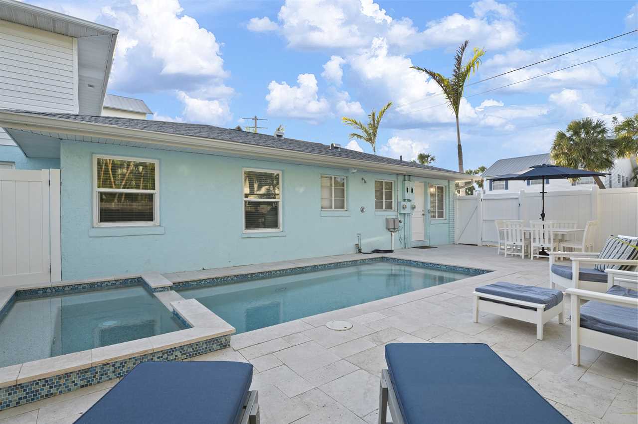 Prefer the outdoors? Luckily for you this home does have a private pool just outside with pool heating for those cold winter months. The pool also has a spa that can be isolated for some late-night soaking to wind down. There's also plenty of seating as well as a shaded table for 6 for those days you ought to soak in the sun to get a nice tan or just to enjoy the Florida air while you eat. There is also beach chairs, a beach umbrella, a cooler, and a wagon available at the property for those short walks to the beach just down the street!