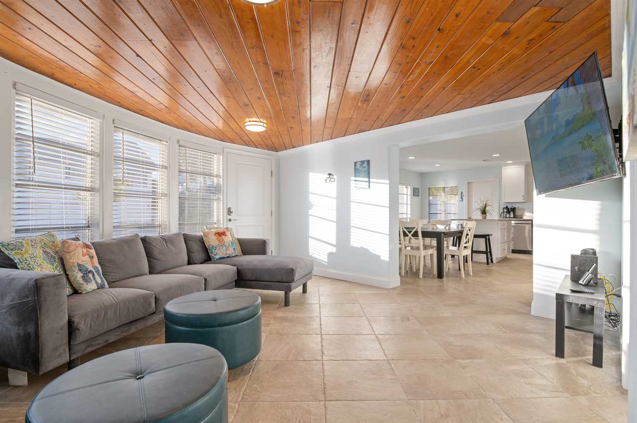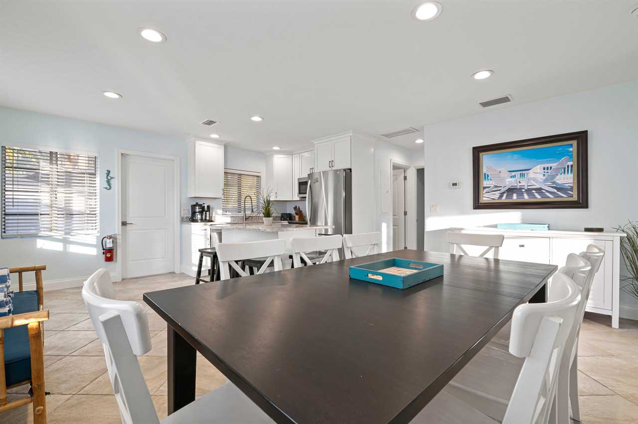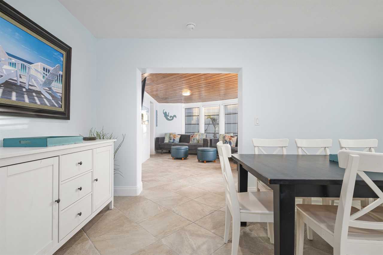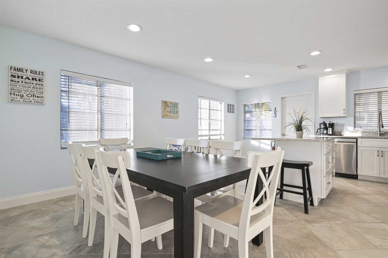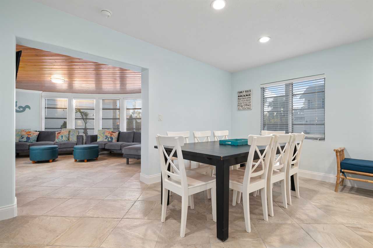 This vibe continues through to the interior of the home with the tropical decor that is spread throughout the open floor plan. The living room, dining room, and kitchen all combine with numerous windows to allow natural lighting to flood the home. The living room provides enough seating for you and all your guests to kick back and hang out or enjoy your favorite movies and shows altogether well the dining room just beside it offers a table with seating for up to eight people.