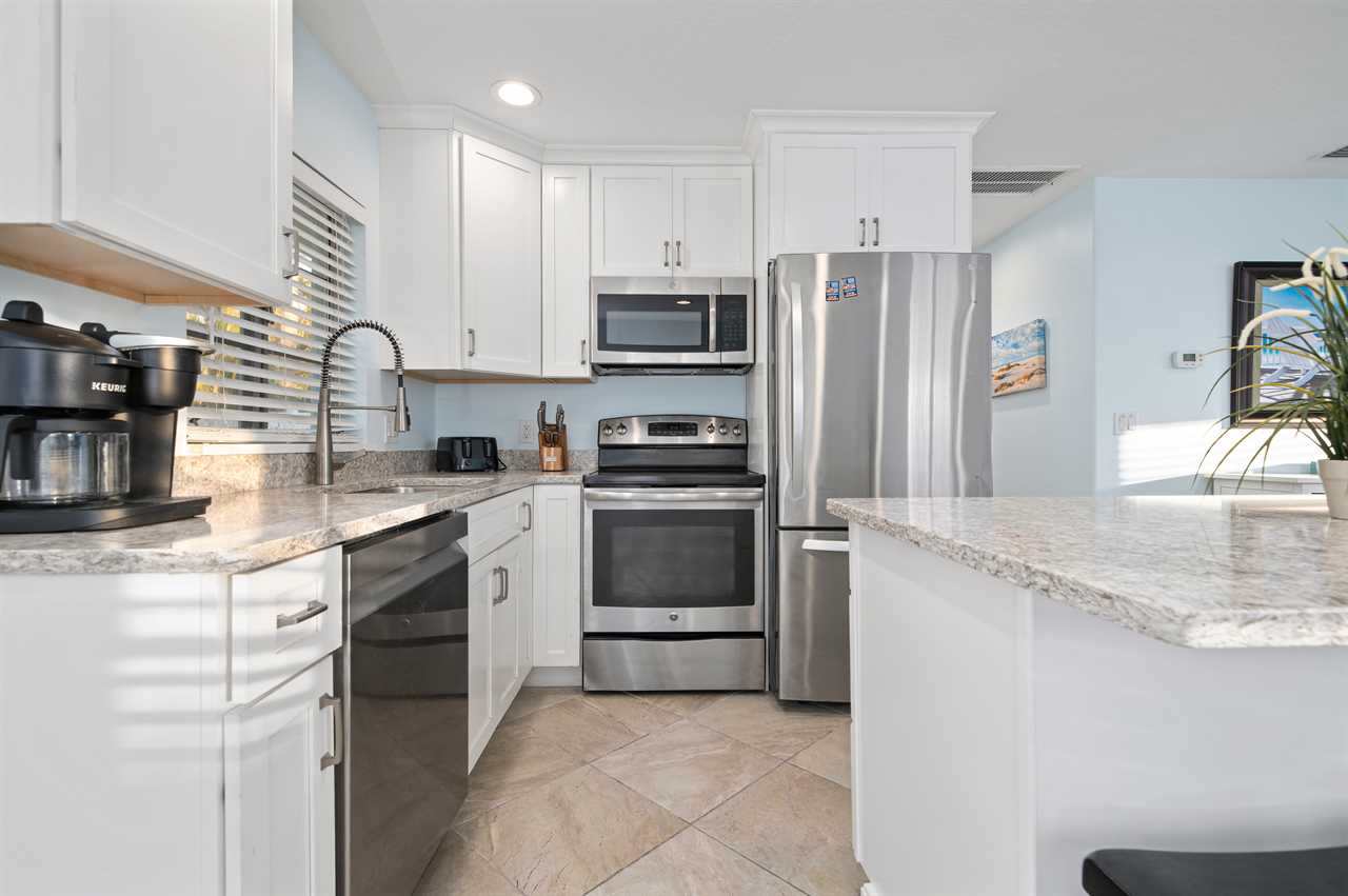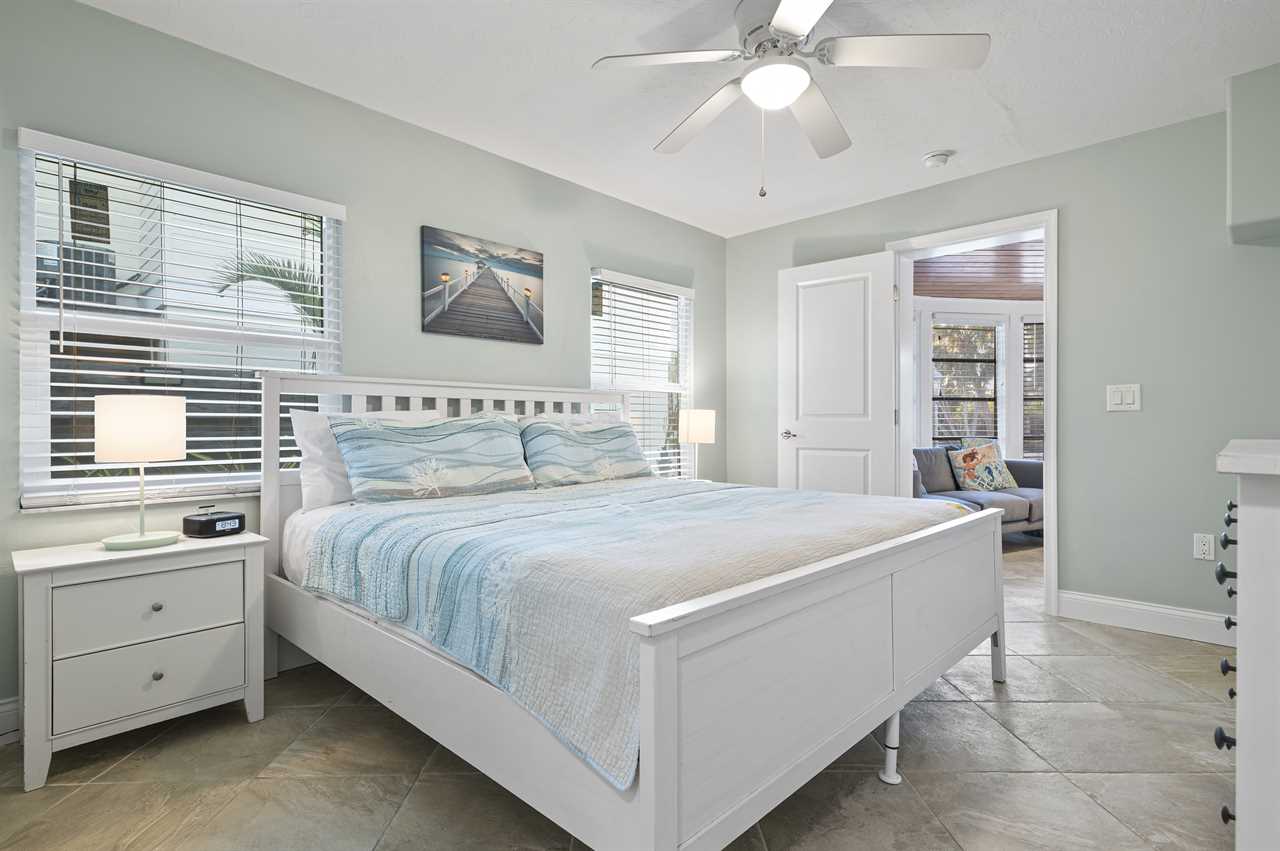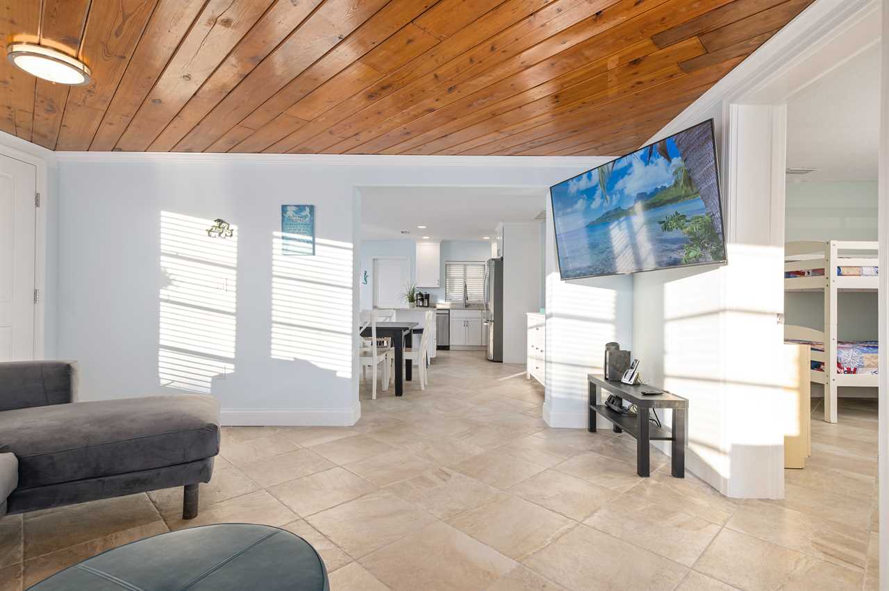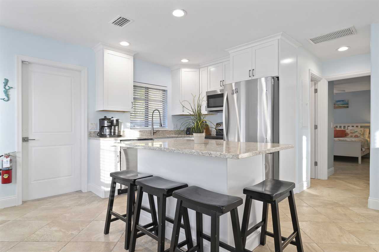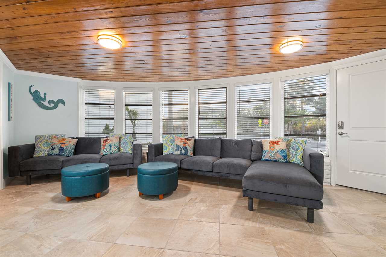This vibe continues through to the interior of the home with the tropical decor that is spread throughout the open floor plan. The living room, dining room, and kitchen all combine with numerous windows to allow natural lighting to flood the home. The living room provides enough seating for you and all your guests to kick back and hang out or enjoy your favorite movies and shows altogether well the dining room just beside it offers a table with seating for up to eight people.