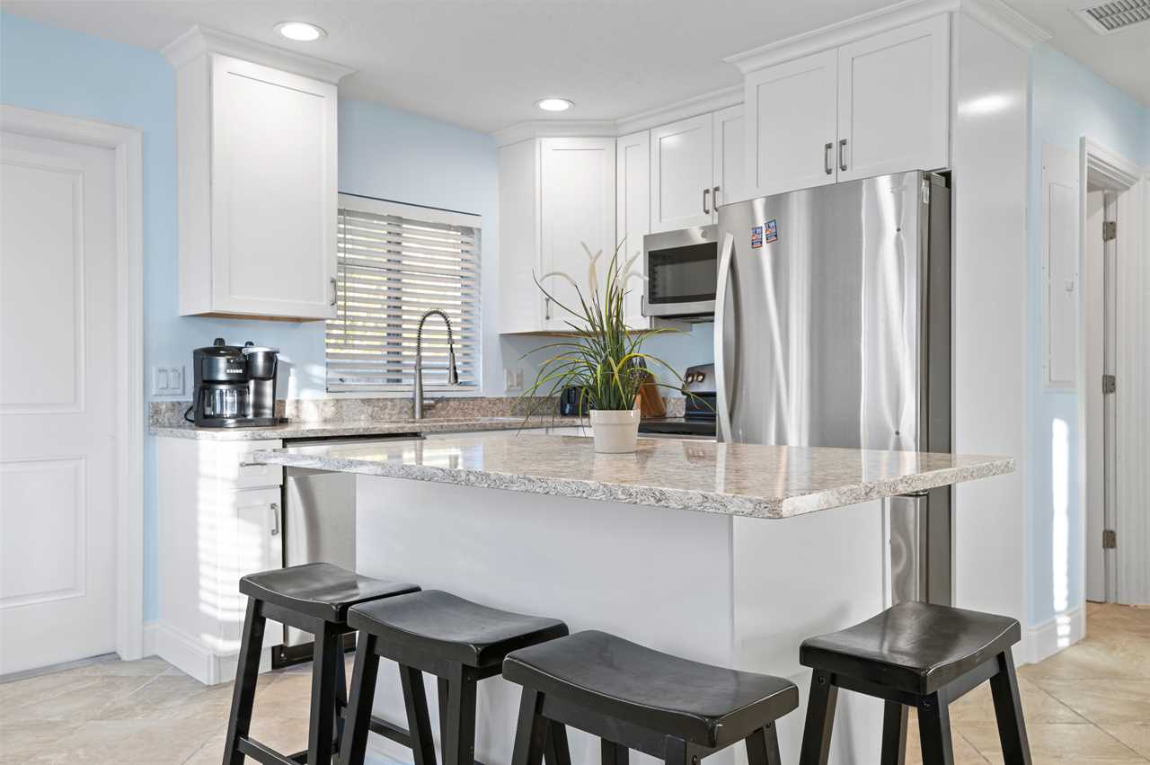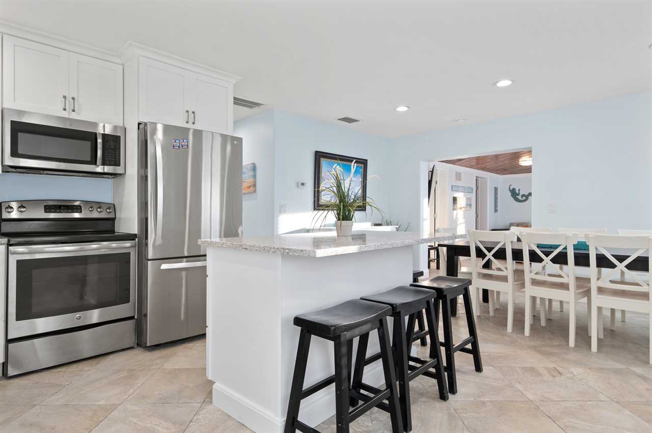 The kitchen comes equipped with all major appliances, as well as all the pots and pans needed for you to cook your favorite homemade meals. With the open floor plan, there is plenty of space so that you will not feel cramped in the kitchen, even if there's more than one chef in the family and plenty of counter space including the large kitchen island makes it easy to prep without missing out on any fun. Preferred cooking outside on the grill? There is a propane grill outside by the pool for your use. The pool area is fenced in and offers additional seating for enjoying a meal outside or catching the rays of the beautiful Florida Sunshine!