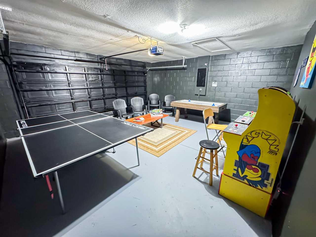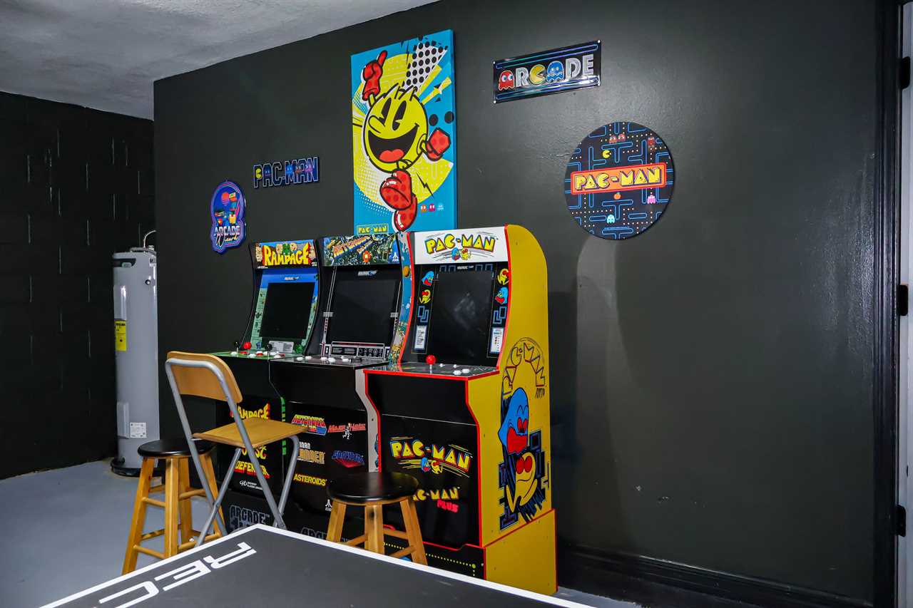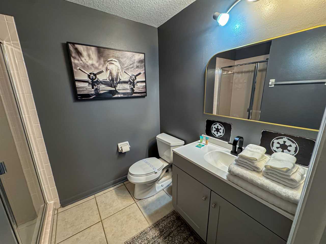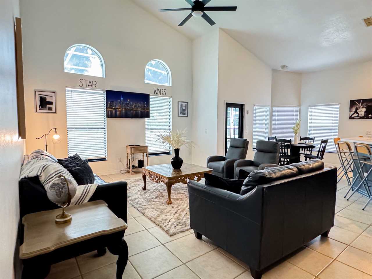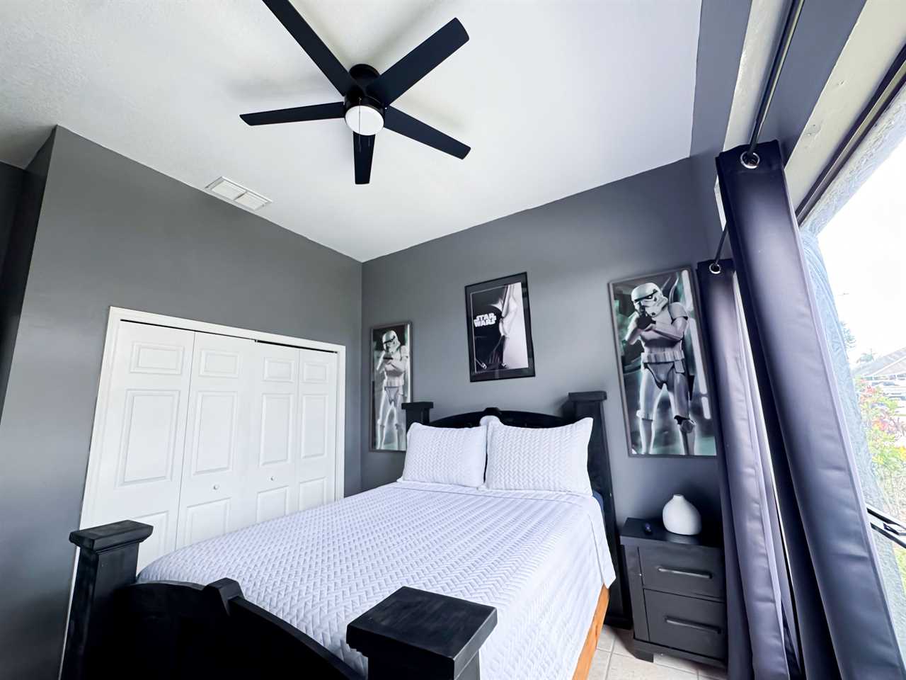 Downstairs, the spacious main master suite provides a relaxing retreat, while an additional Star Wars–themed bedroom with a queen bed continues the home's exciting design. Outside, a private screened-in pool offers the perfect place to unwind after a day at the parks, and the fully equipped games room—featuring a ping pong table, air hockey, and arcade games—ensures endless fun for guests of all ages.
