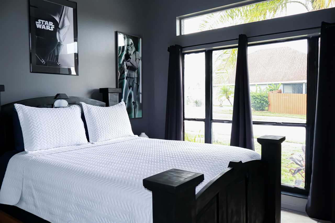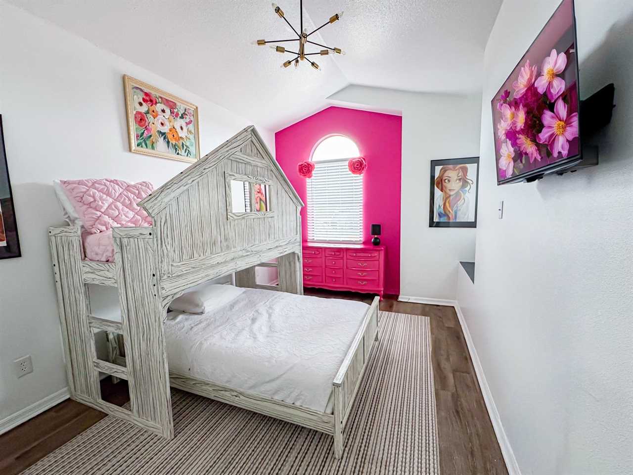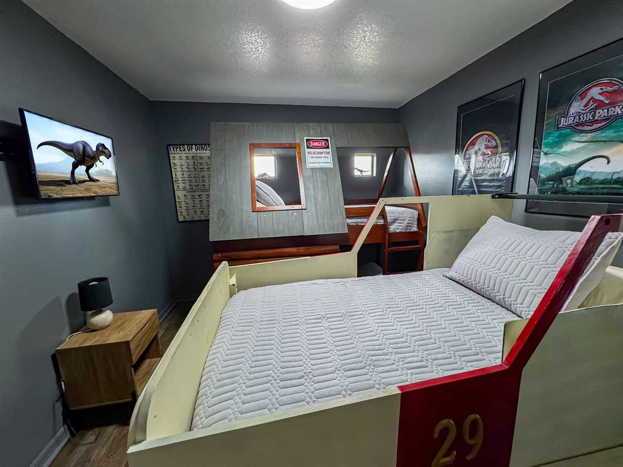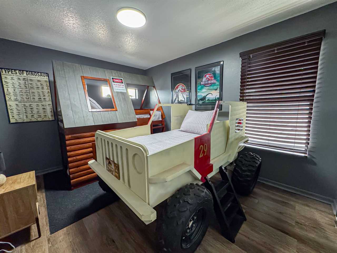 The main living area sets the tone with its elegant Star Wars–themed décor, combining rich, dark tones with imaginative touches that create a unique and immersive atmosphere. Upstairs, guests will find three themed bedrooms: a charming Princess room with a bunk bed, an adventurous Jurassic Park room with a twin bed and bunk bed, and a whimsical Walt Disney room with a queen bed.