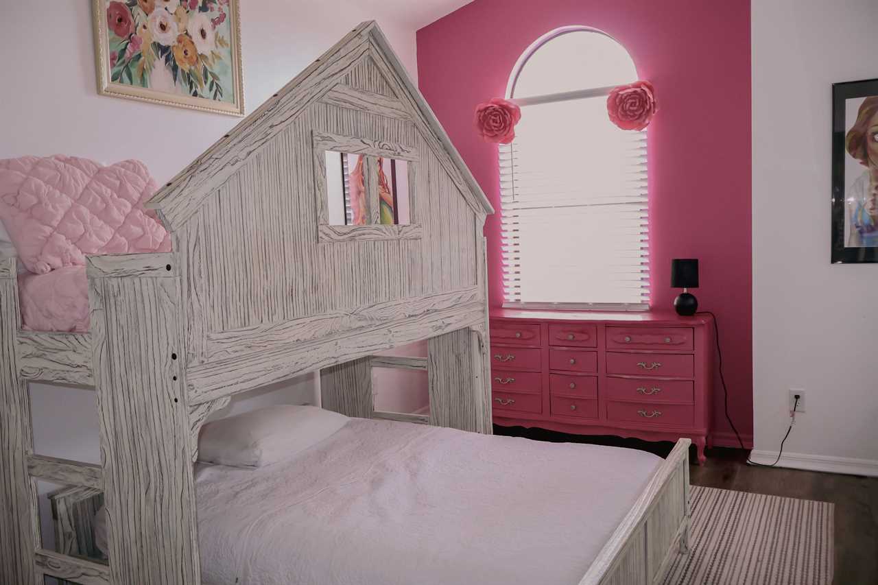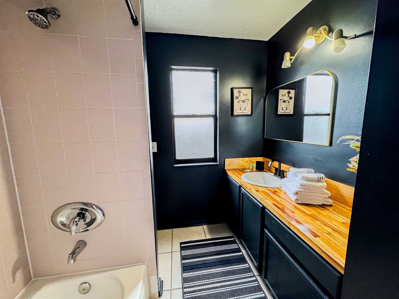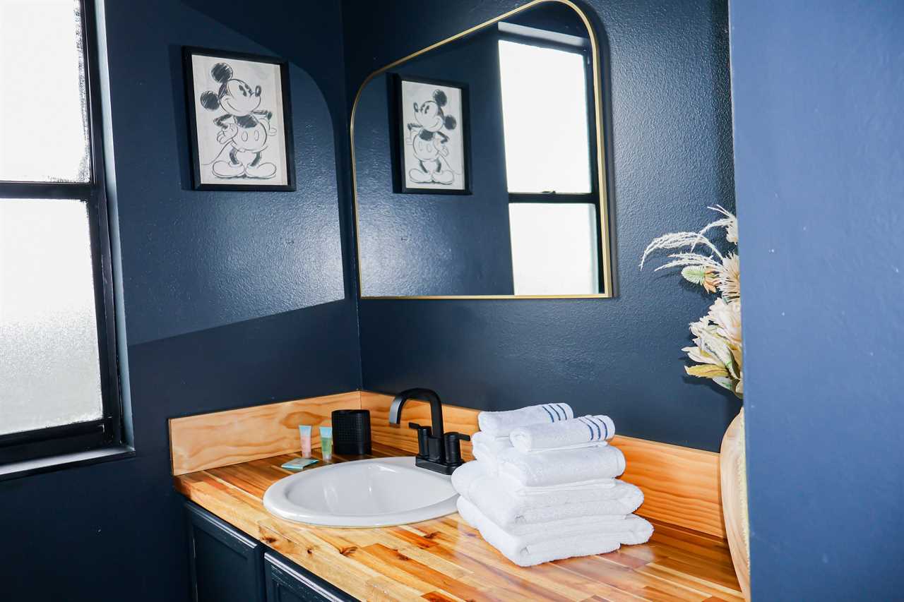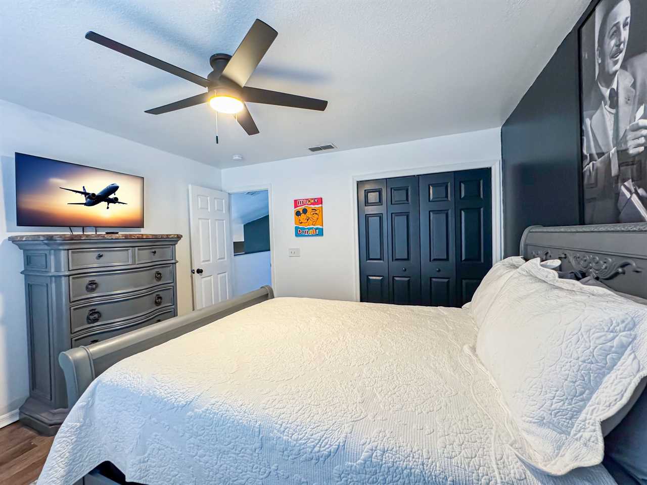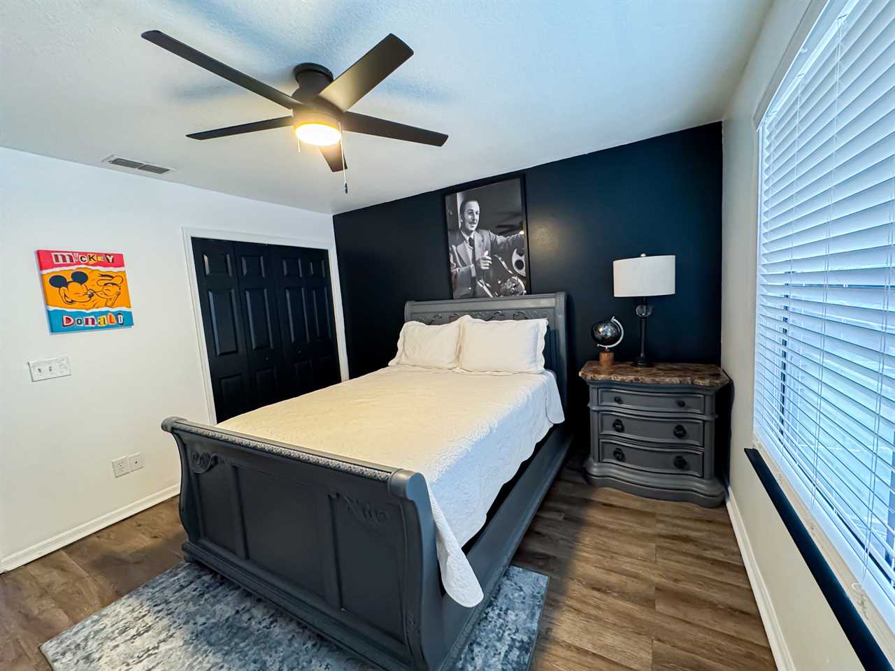 The main living area sets the tone with its elegant Star Wars–themed décor, combining rich, dark tones with imaginative touches that create a unique and immersive atmosphere. Upstairs, guests will find three themed bedrooms: a charming Princess room with a bunk bed, an adventurous Jurassic Park room with a twin bed and bunk bed, and a whimsical Walt Disney room with a queen bed.