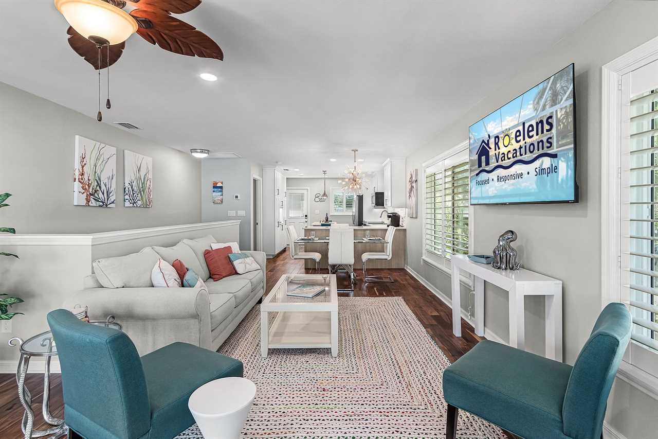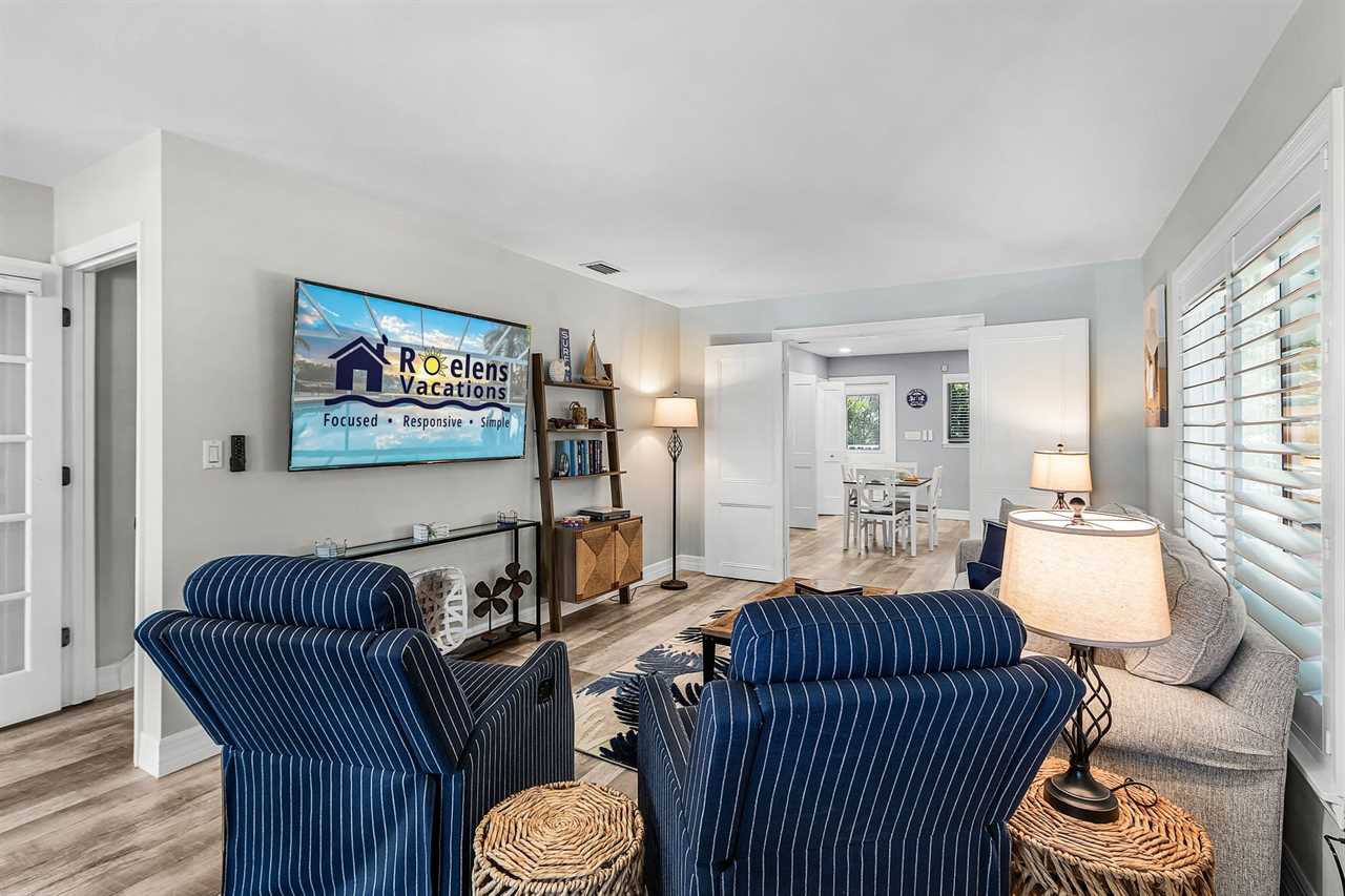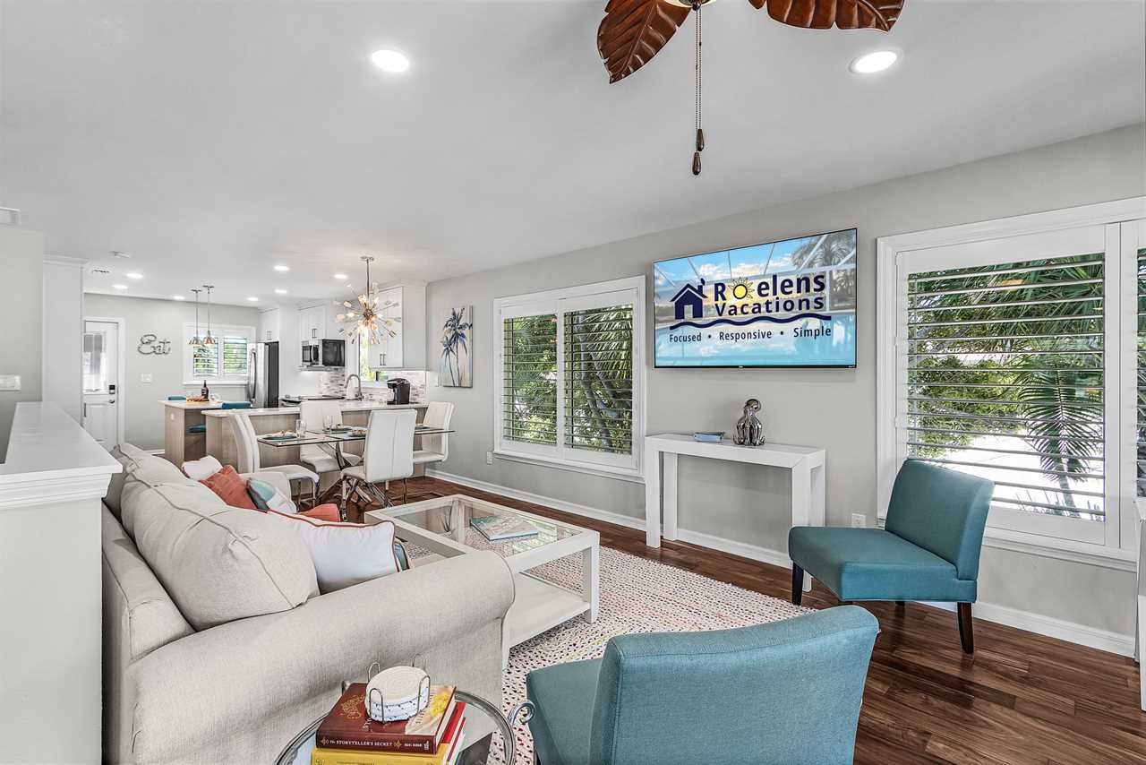Two Separate Floors with Comfortable Living Spaces and Smart TVs: Unwind in bright, airy lounges on each floor, furnished with plush seating, smart TVs, and coastal-inspired decor—perfect for movie nights or quiet relaxation.