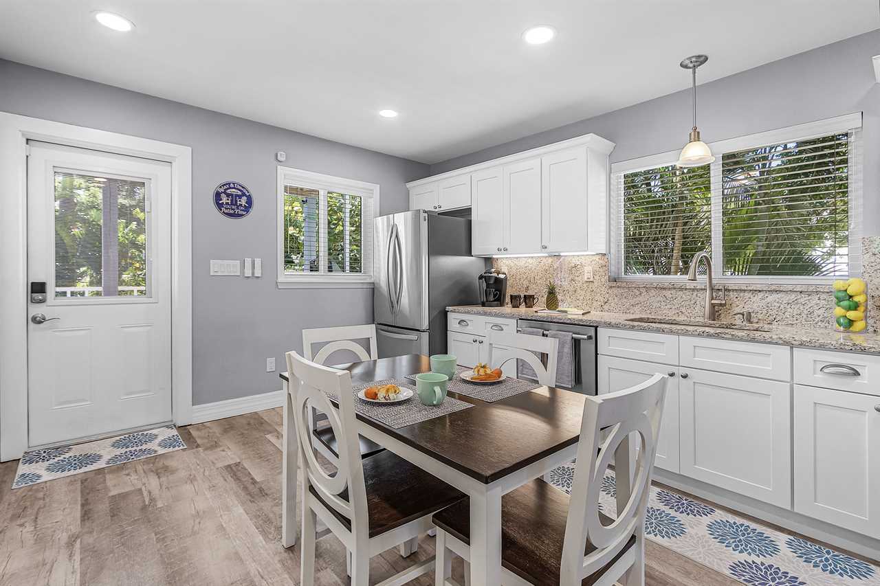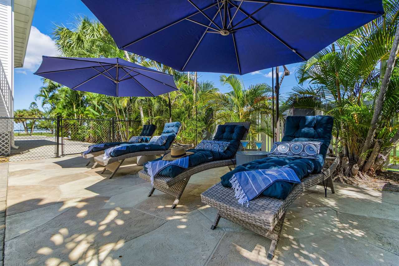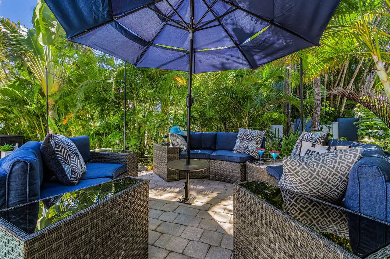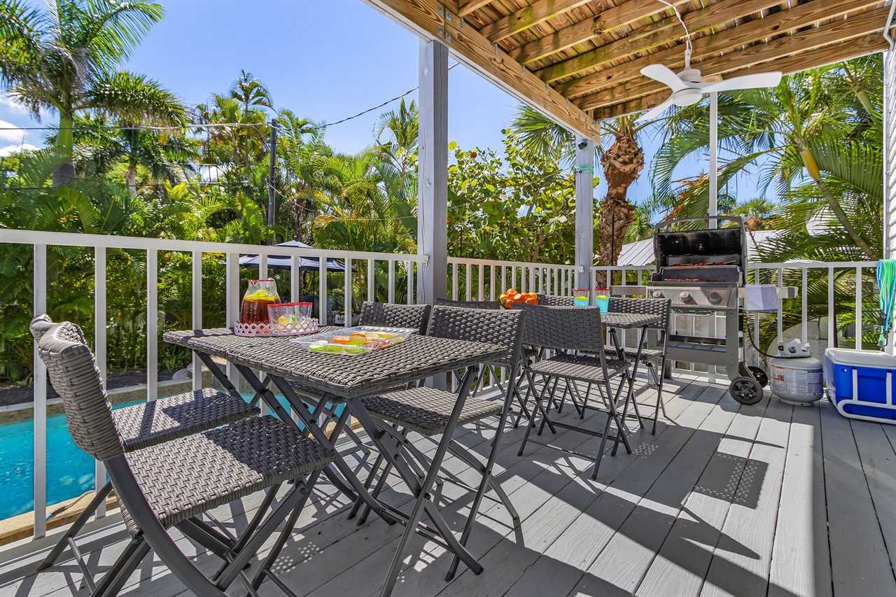 Outdoor Dining & Barbecue Area: Enjoy delicious meals alfresco in the spacious backyard, featuring a dining area and grill—ideal for relaxing barbecues beneath the swaying palms.